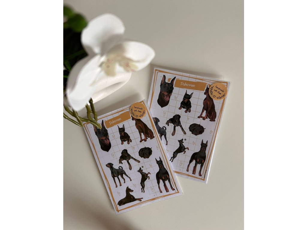 Jeden arch obsahuje:9x samolepky Dobrmanů9x samolepky srdíček