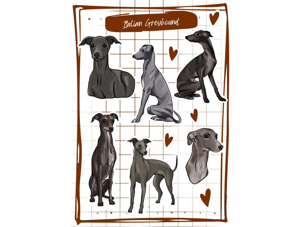Jeden arch obsahuje:6x samolepky chrtíka5x samolepky srdíček