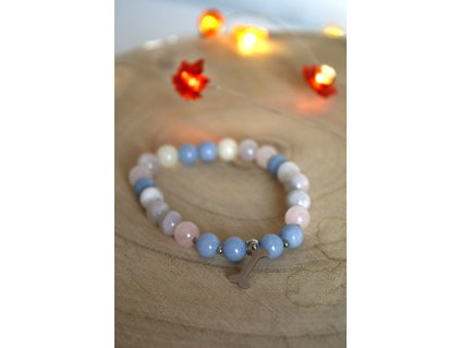 Originální modrobílý náramek s přívěskem ve tvaru kostičky.
