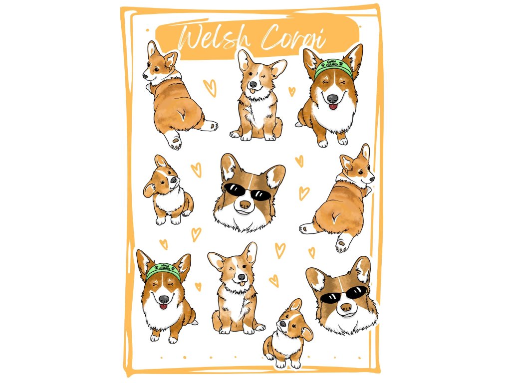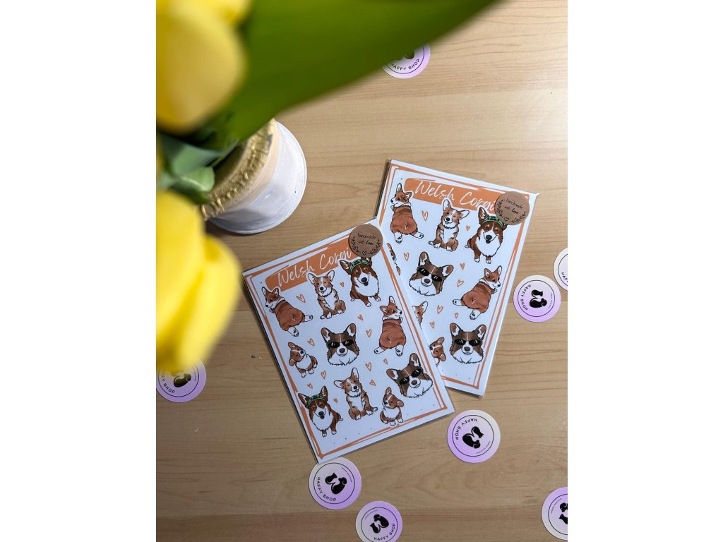 Jeden arch obsahuje:10x samolepky corgísků11x samolepky srdíček
