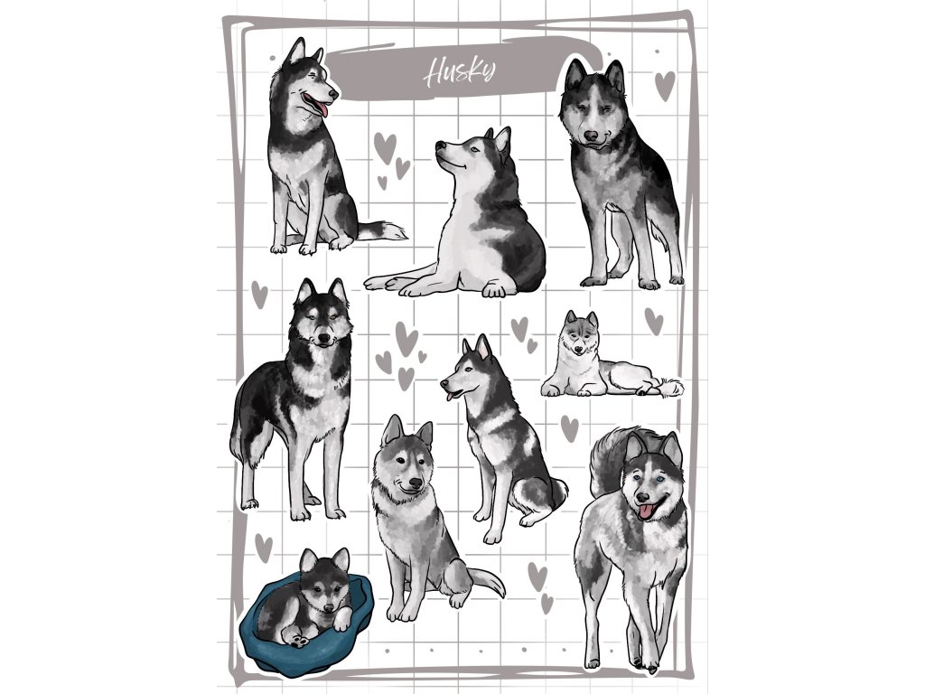 Jeden arch obsahuje:9x samolepky husky9x samolepky srdíček