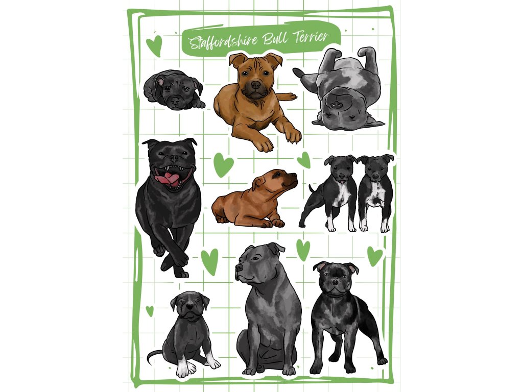 Jeden arch obsahuje:9x samolepky stafordů7x samolepky srdíček