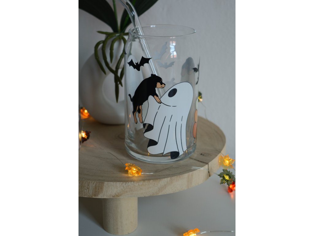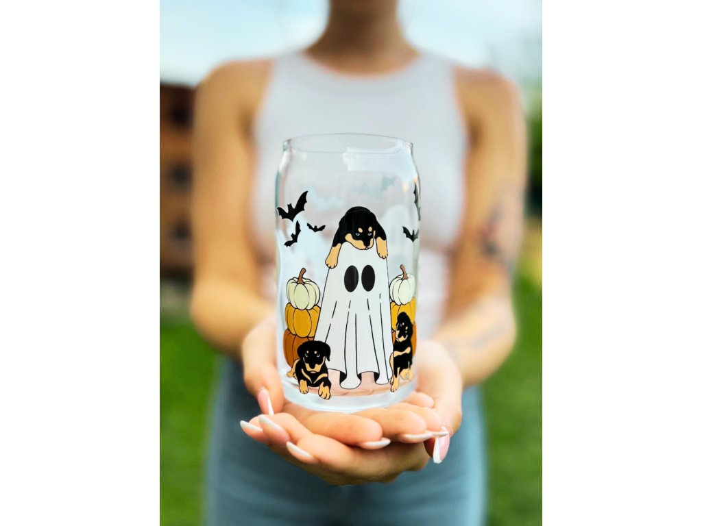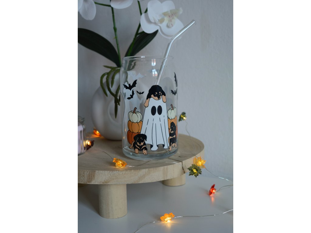 Naprosto originální sklenička s motivem halloweenských rotvajlerů.