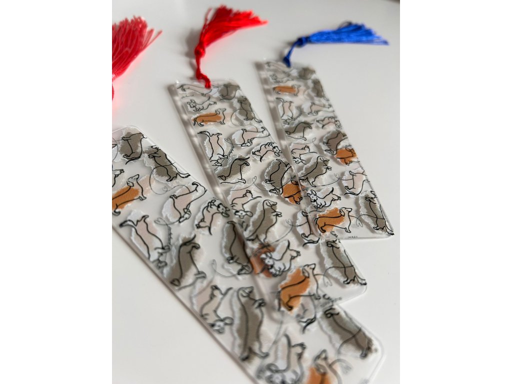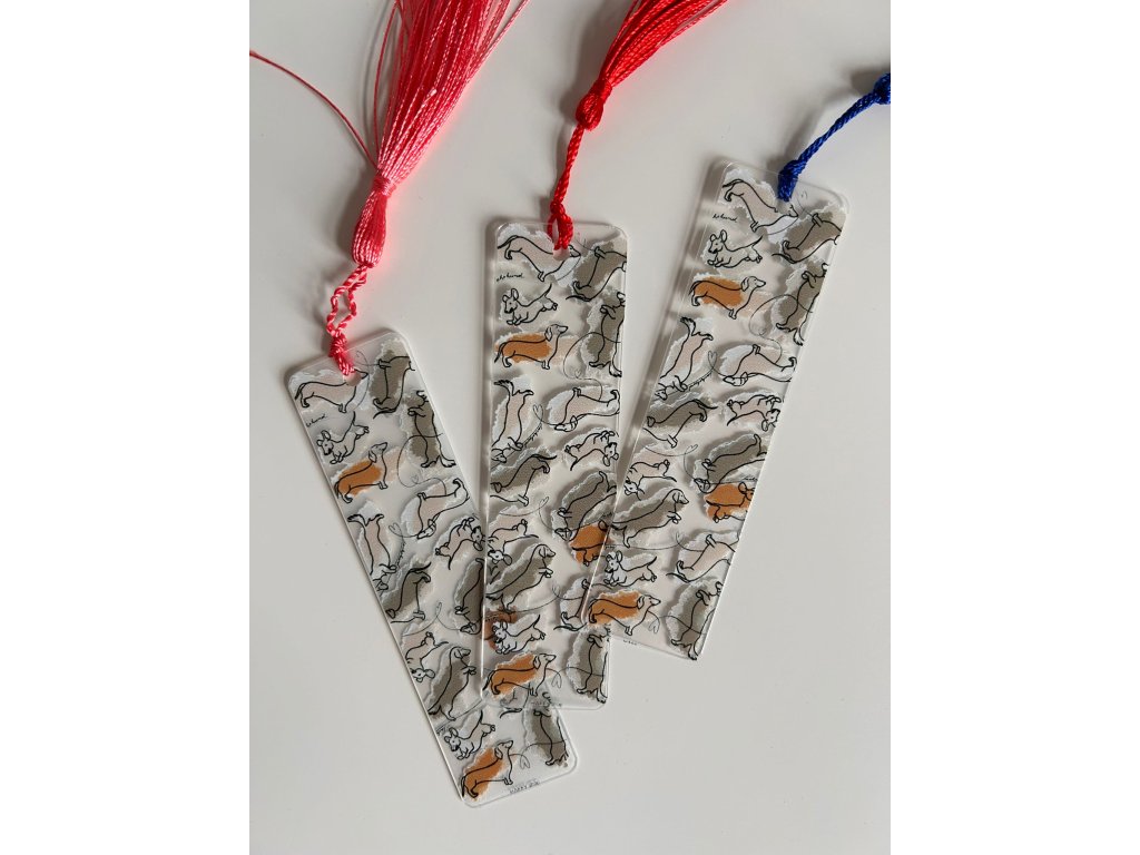 Transparentní záložka s motivem jezevčíků + barevný střapec