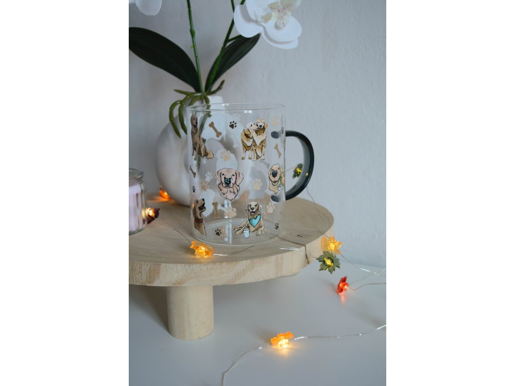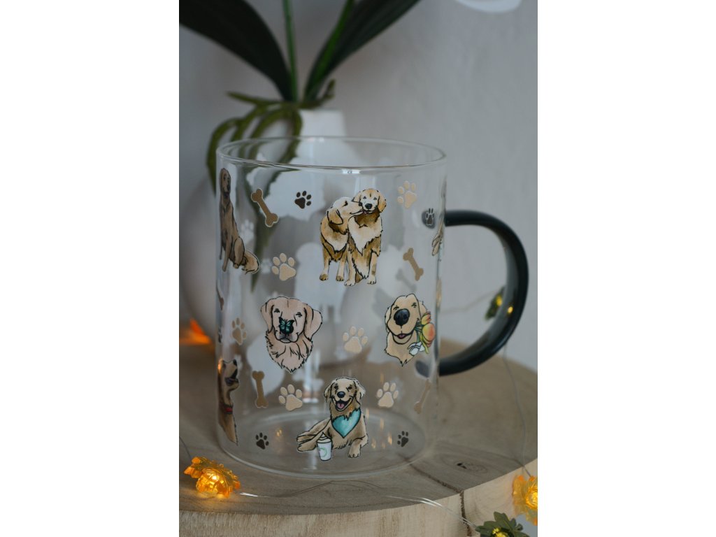Originální sklenička s uchem a s motivem zlatých retrívrů.